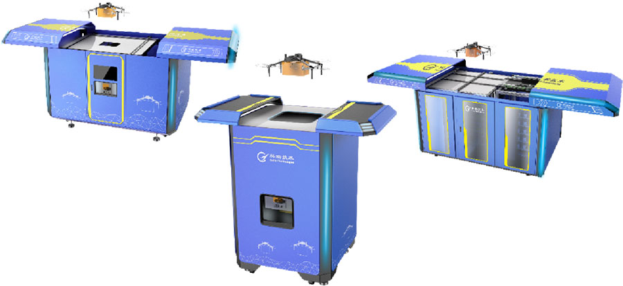 顶部自动对开门,停机坪使用面积最大化,方便无人机降落。专用货架可放置 20 个存储仓,每个仓位单独存取。底架采用型钢焊接成型,保证整体强度。可配置充电模块,方便无人机充电。
