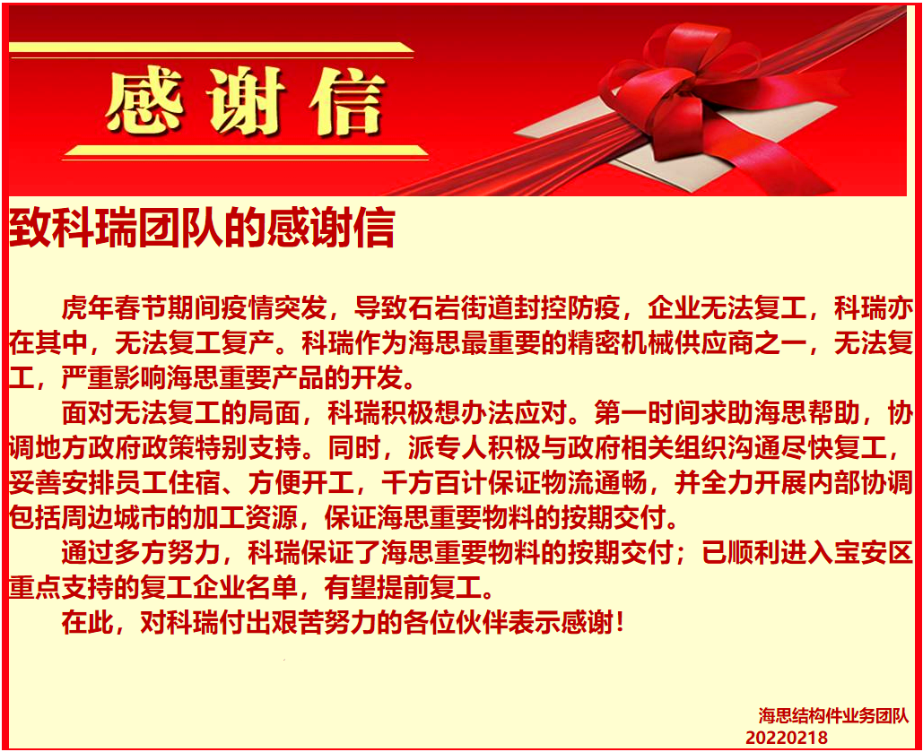 2月18日,公司技术精密加工事业部收到客户热情洋溢的感谢信,点名感谢团队5名成员。